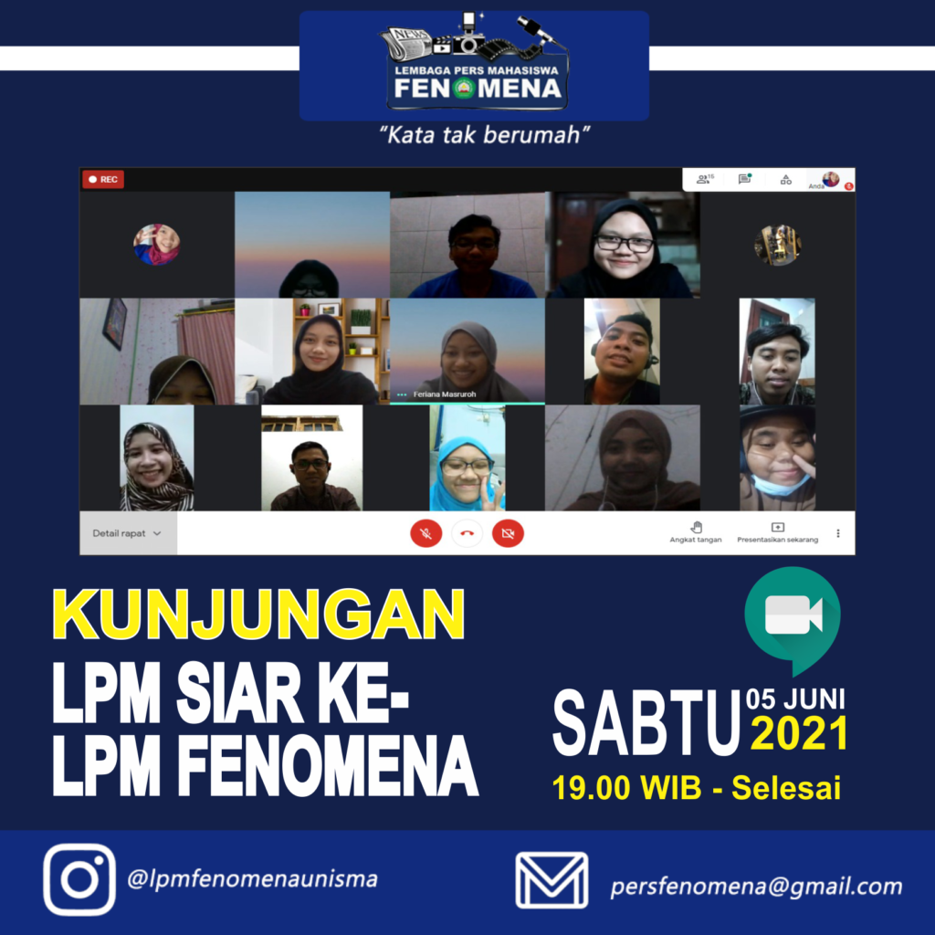 Pada Sabtu (5/6), LPM Fenomena FKIP Unisma menerima kunjungan dari LPM Siar Universitas Negeri Malang yang berlangsung secara daring menggunakan aplikasi Google Meet. Kegiatan ini bertujuan untuk menjalin silaturahmi antara LPM Siar dengan LPM Fenomena.