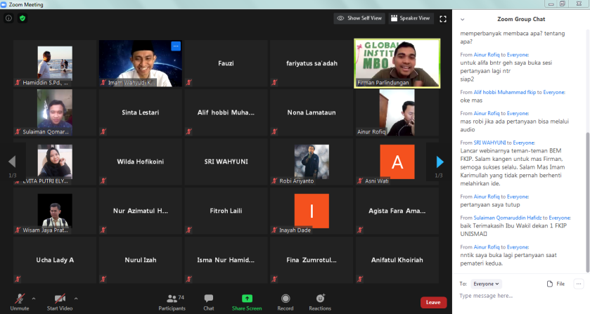 “Banyak ilmu yang bisa diambil dari webinar pendidikan yang telah dilaksanakan, diantaranya keterampilan literasi dan menulis, serta dapat membuka pola pikir bahwa bahasa inggris itu penting sebagai penunjang kita untuk kedepannya. Harapan kedepan untuk BEM FKIP dapat menatangkan pembicara-pembicara yang informatif seperti ini karena sangat menguntungkan.”, terang Wisam Jaya Pratama, mahasiswa Unisma selaku partisipan.