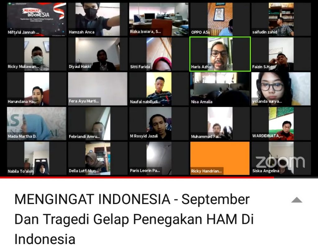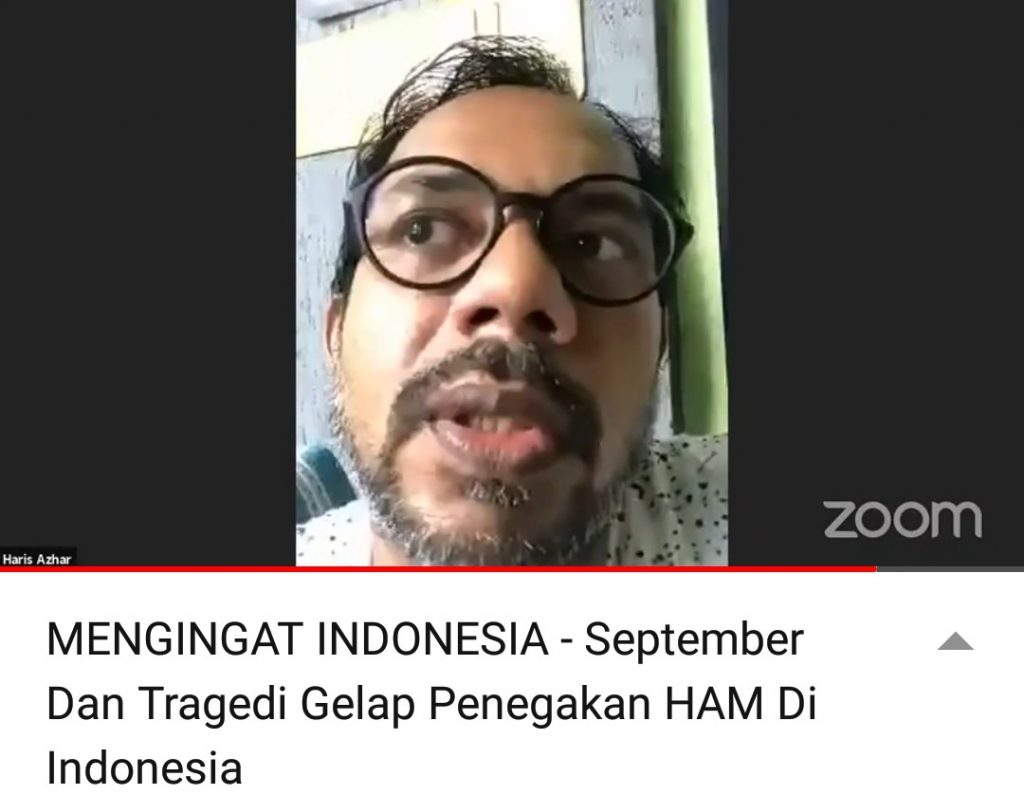 Webinar dibuka sekira pukul 09.30 oleh moderator Diyaul Hakki selaku Menteri Kemensospolkumham. Sebagai pembicara pertama Haris Azhar, Founder Lokataru Foundation menyatakan perihal pembahasan mengenai September hitam. Sebab, di bulan itu banyak sekali peristiwa-peristiwa yang menyangkut dengan hak asasi manusia.