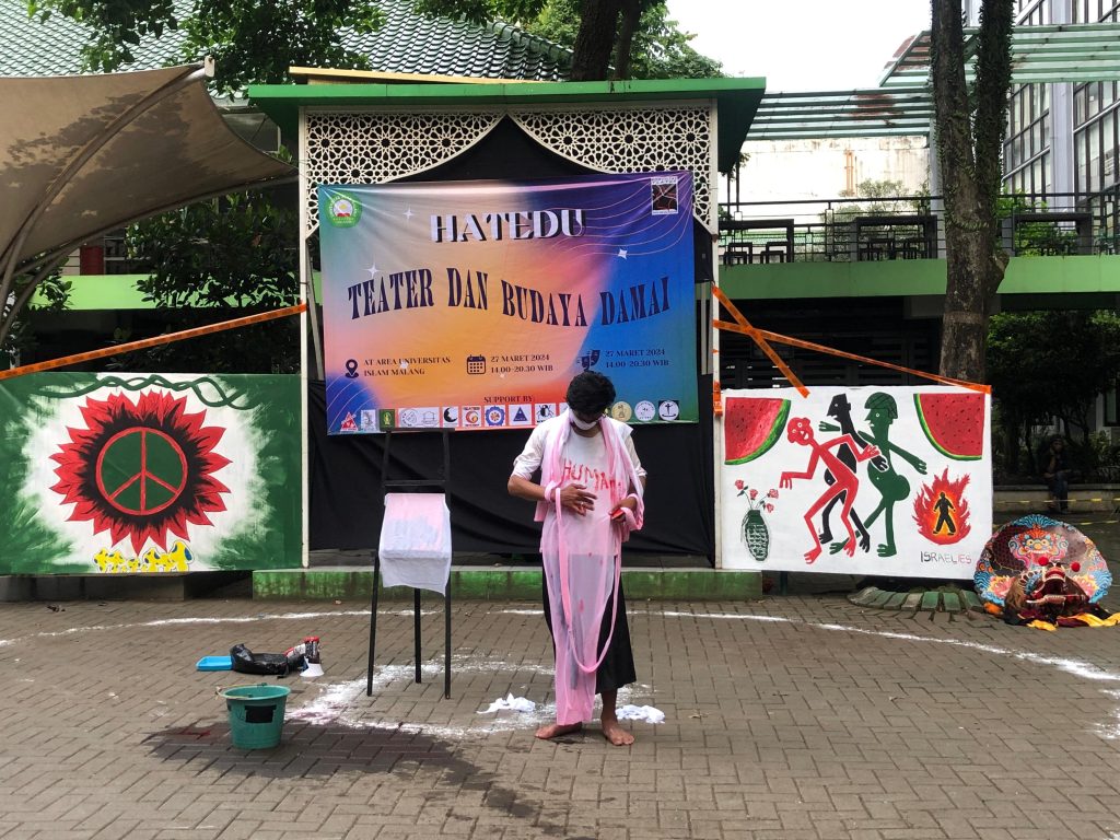 LPM Fenomena, Unit Kegiatan Mahasiswa Komunitas Teater Universitas Islam Malang sedang merayakan HATEDU (Hari Teater Sedunia) dengan mengangkat tema “Teater dan Budaya Damai” di Area Universitas Islam Malang (27/3/2024).